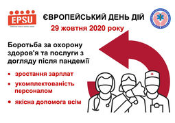 Європейська Федерація профспілок громадського обслуговування (EPSU), до лав якої входить Профспілка працівників охорони здоров’я України, оголосила 29 жовтня 2020 ЄВРОПЕЙСЬКИМ ДНЕМ ДІЙ для забезпечення захисту працівників охорони здоров’я та соціального обслуговування в період, коли увесь світ веде боротьбу із пандемією COVID-19.