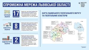 На Львівщині попередньо визначено 27 лікарень, які увійдуть до спроможної мережі медичних закладів. Зокрема, Львівський госпітальний округ складатиметься із 2 надакластерних лікарень, 8 кластерних та 17 загальних лікарень.